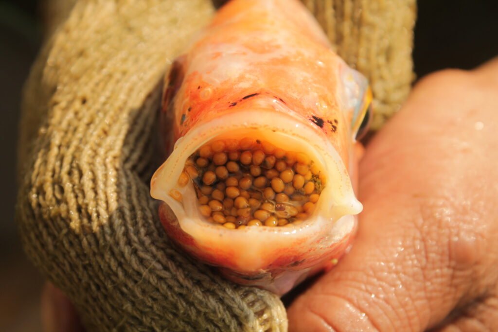 Pengeraman Mulut: Setelah perkawinan, induk betina mengambil dan menyimpan telur yang sudah dibuahi ke dalam mulutnya (mouthbrooding).