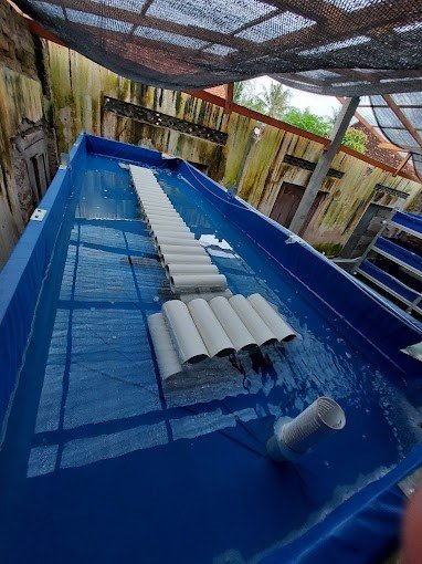 - Kepadatan tebar: Kepadatan tebar ideal untuk lobster air tawar di kolam terpal adalah 20-30 ekor per meter persegi.